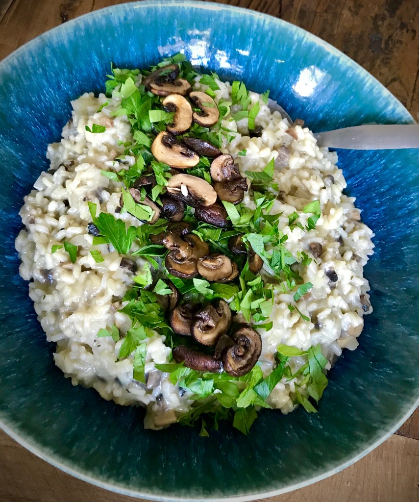 Risotto på skogschampinjon och kantarell. Älskar risotto. Kryddade med lök, vitlök, vitt vin och grönsaksbuljong. Till sist massor med parmesan. Något soom vi brukar göra ibland är att tillsätta gröna färsk spröd sparris, som är supergott att ha i.