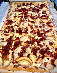 Smördegssnittar med baconsmul, päron och ädelost. Väldigt gott till fredagsbubblet ikväll. Dessa gjorde vi lördags hos min väninna, och det blir nog ett gäng ikväll igen. Denna kombo är härlig med både syra, sälta och sötma till osten!