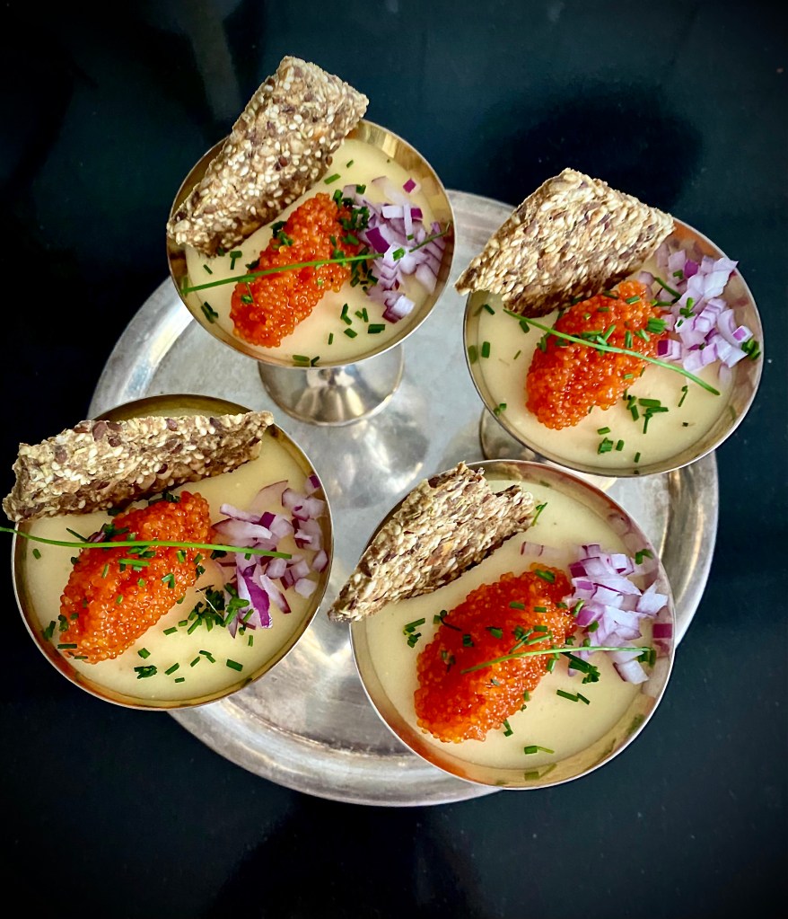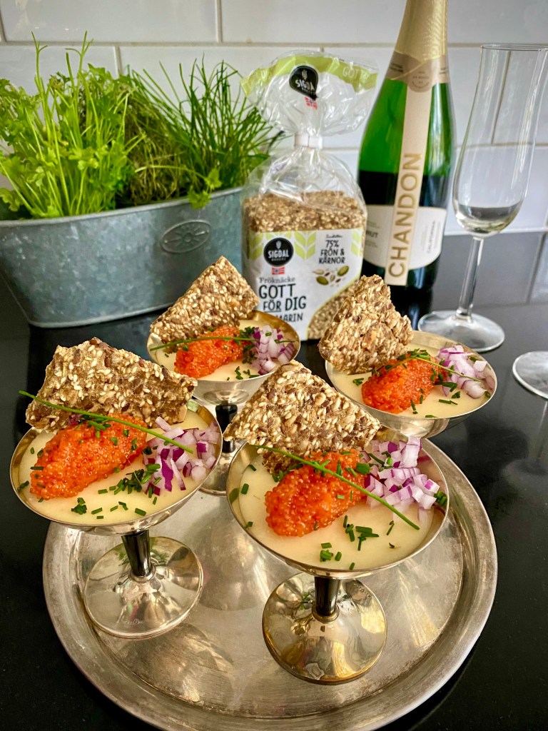 Fördela i martiniglas eller snapsglas, låt stå i kylen minst 1 timme. Toppa pannacottan med löjrom el kaviar, rödlök, gräslök och fröknäcke.