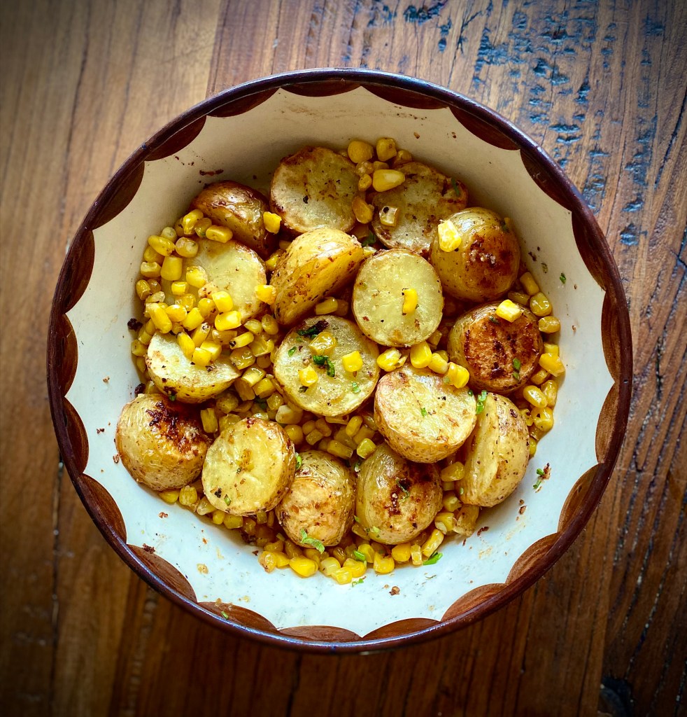 Färskpotatis som rostas i ugn med vitlök och majs, Riktigt najs! Enkelt, och gott! Passar till det mesta. Testa!