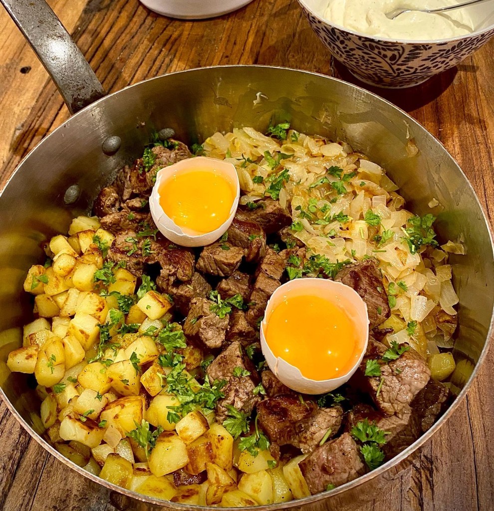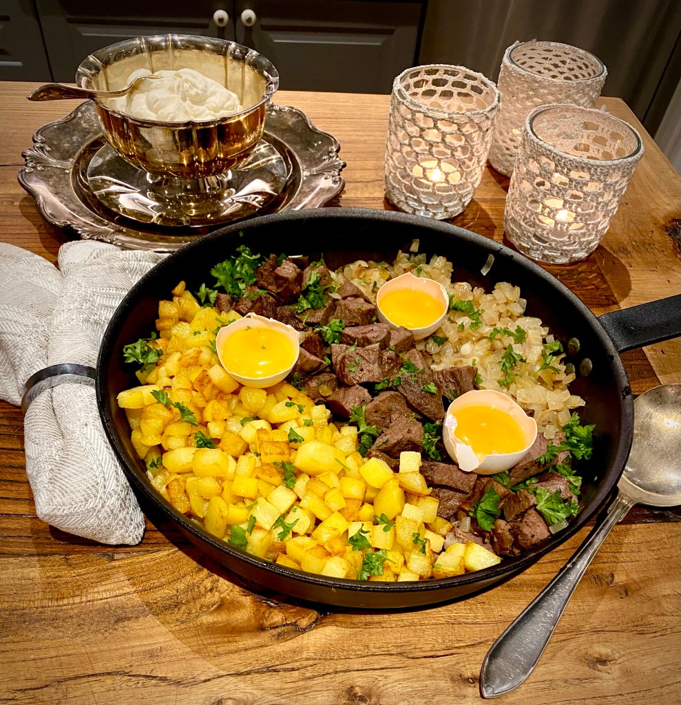 Börja med att hacka lök, tärna potatis och skiva köttet i kuber. Skär inte köttet i för små kuber, det ska vara ”medium rare” tycker jag.
