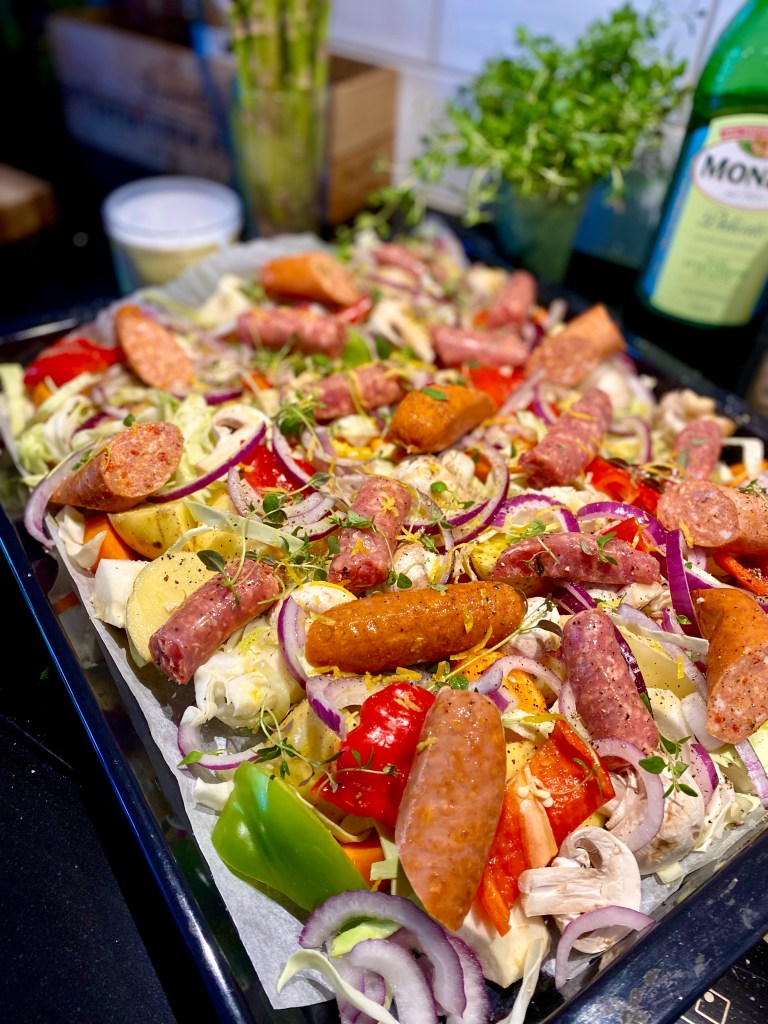 Ugnsbakad chorizo på plåt med härliga kryddor, grönsaker och toppad med tsaziki. Älskar den här typen av mitt-i-veckan mat som sköter sig själv, är bra, riktig och synd mat men ändå bjuder på sköna smaker. Ta de grönsaker och rotfrukter som du gillar och rosta tillsammans med god korv, blanda gärna olika typer av korv. Vi har kört med alla möjliga, både salsiccia, lammkorv, kabanoss och pusta. Mer lättlagat kan det knappast bli.
