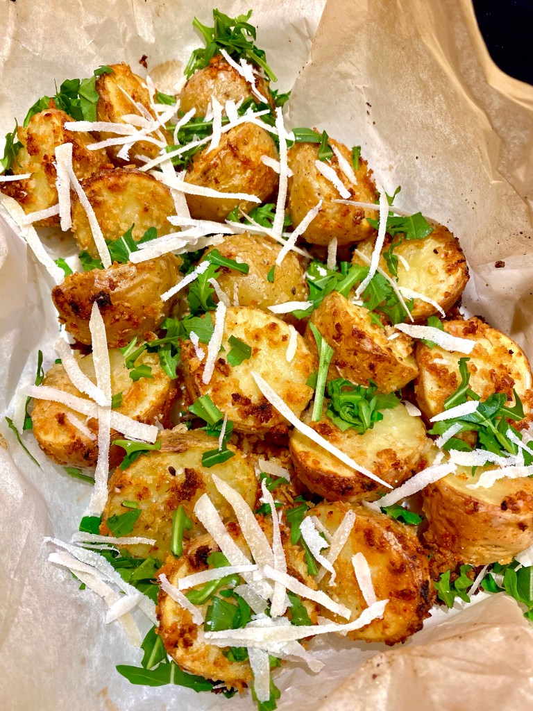 400 gram potatis 3 msk olivolja 2 vitlöksklyftor 0,75 dl parmesan 1-2 msk panko Salt och peppar Hackad ruccola vid servering .