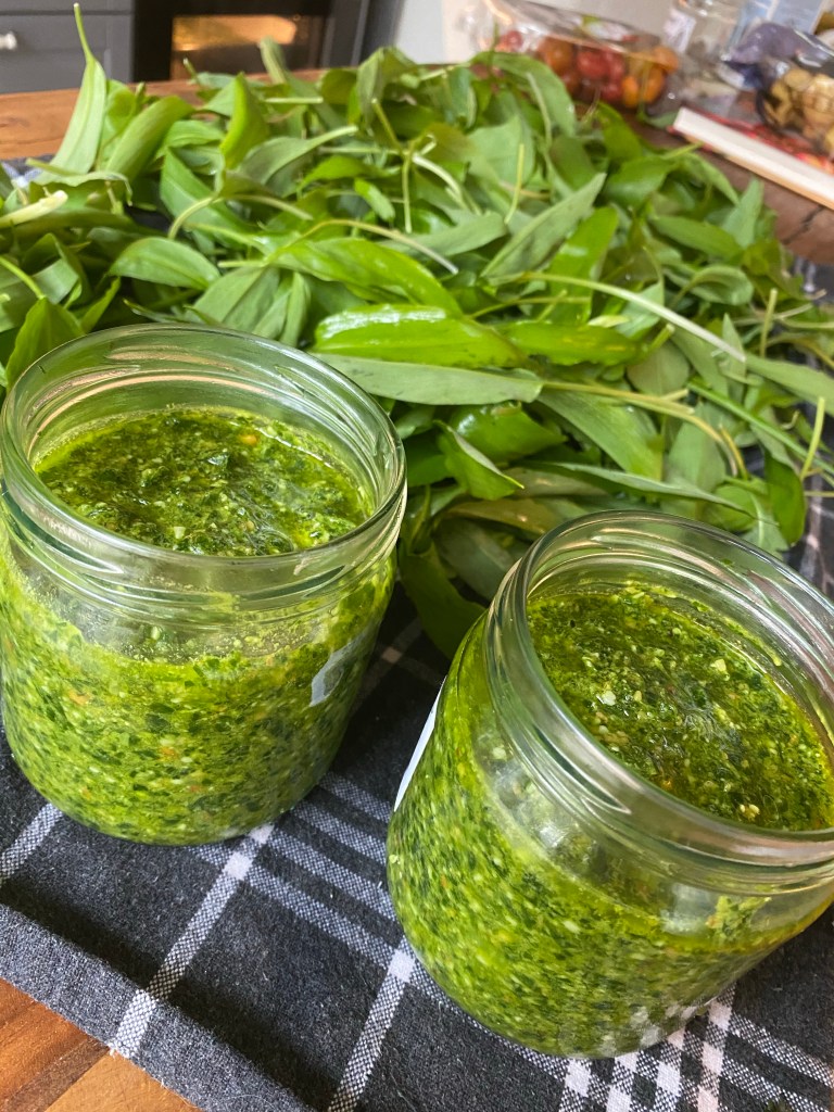 Lägg lite krispig sallad på ett stort fat. Lägg på den rostade potatisen och blanda med ramslökspesto (recept på det finns i blogg). Blanda runt ordentligt. Du kan ta lite extra olivolja om du har gjort en tjock pesto. Garnera med rostade solroskärnor eller pinjenötter och avsluta med riven parmesan på toppen.