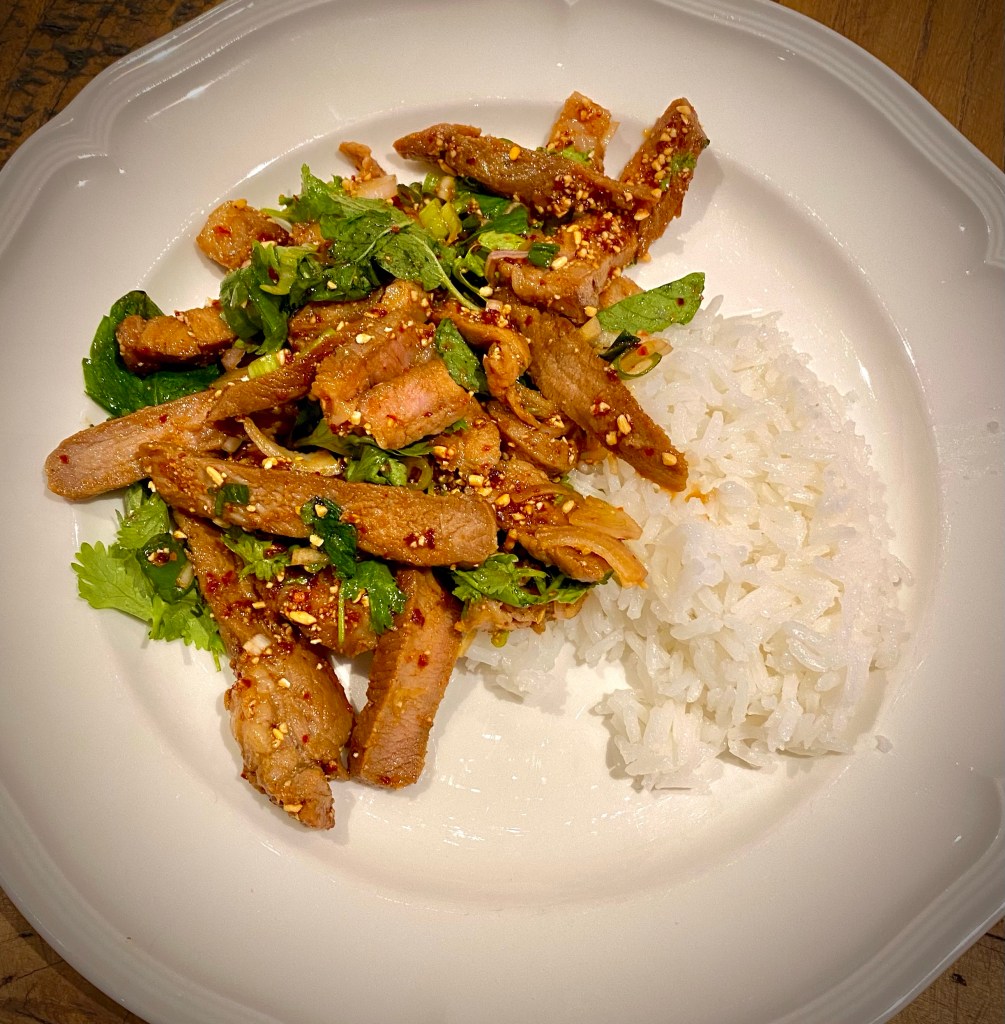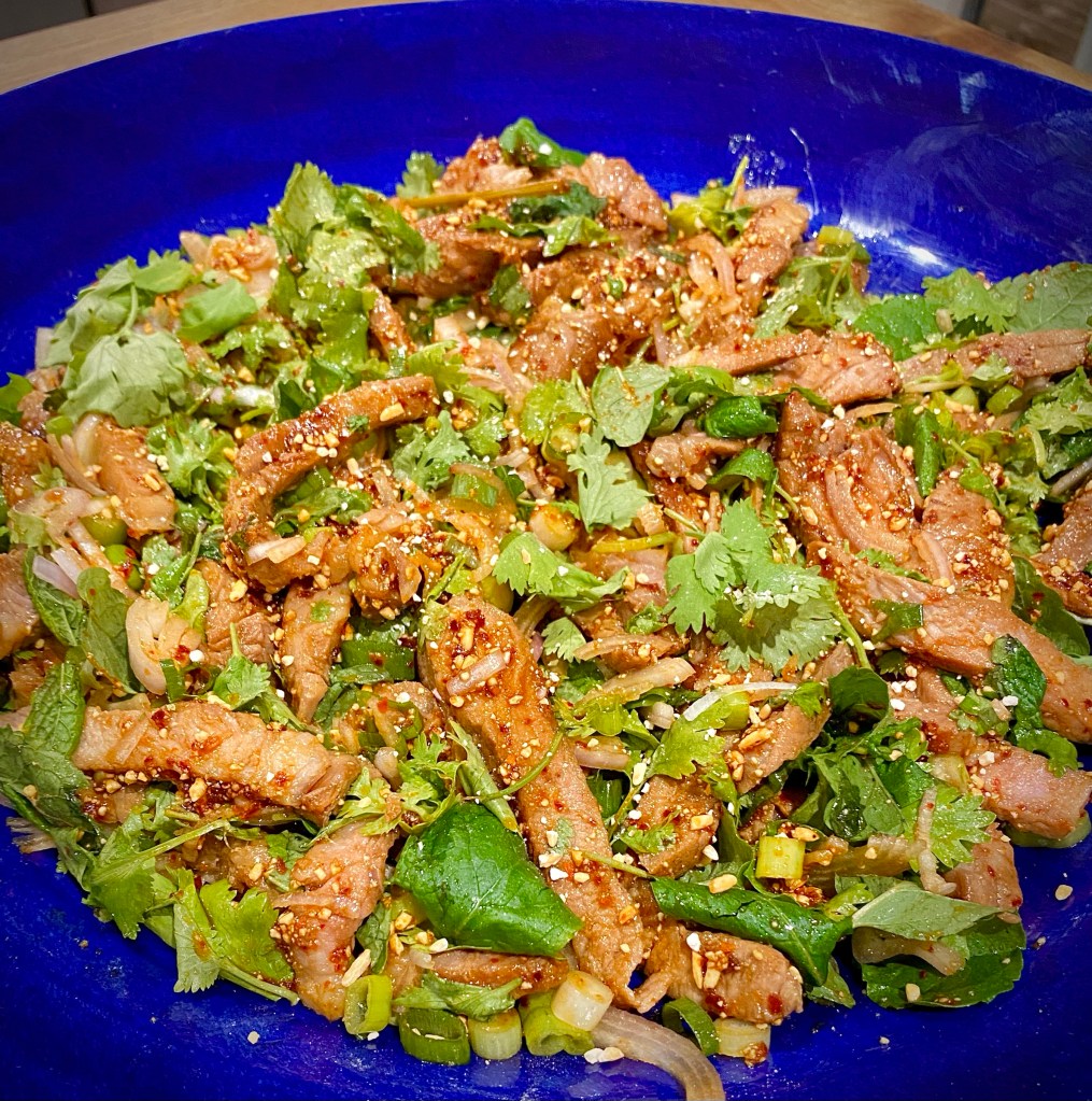 Nam Tok Moo – en härlig thai sallad på marinerad karré med underbara smaker, en blandning av sött och salt ….. och syra.