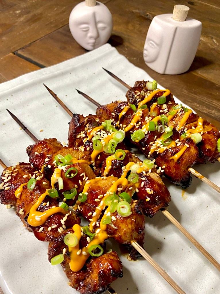 Skär kycklingfiléerna i kuber. Blanda alla ingredienserna i marinaden och smaka av. Du kanske vill justera styrka och sötma enligt din egen smak. Låt kycklingen marinera i minst 1 timme i kylen, gärna längre. Trä kycklingbitarna på spett – 4-5 bitar på varje. Grilla på grill eller i ugn 200 grader varmluft i 20 min. Pensla då och då. Servera med chilimajo. Sesamfrön och salladslök.