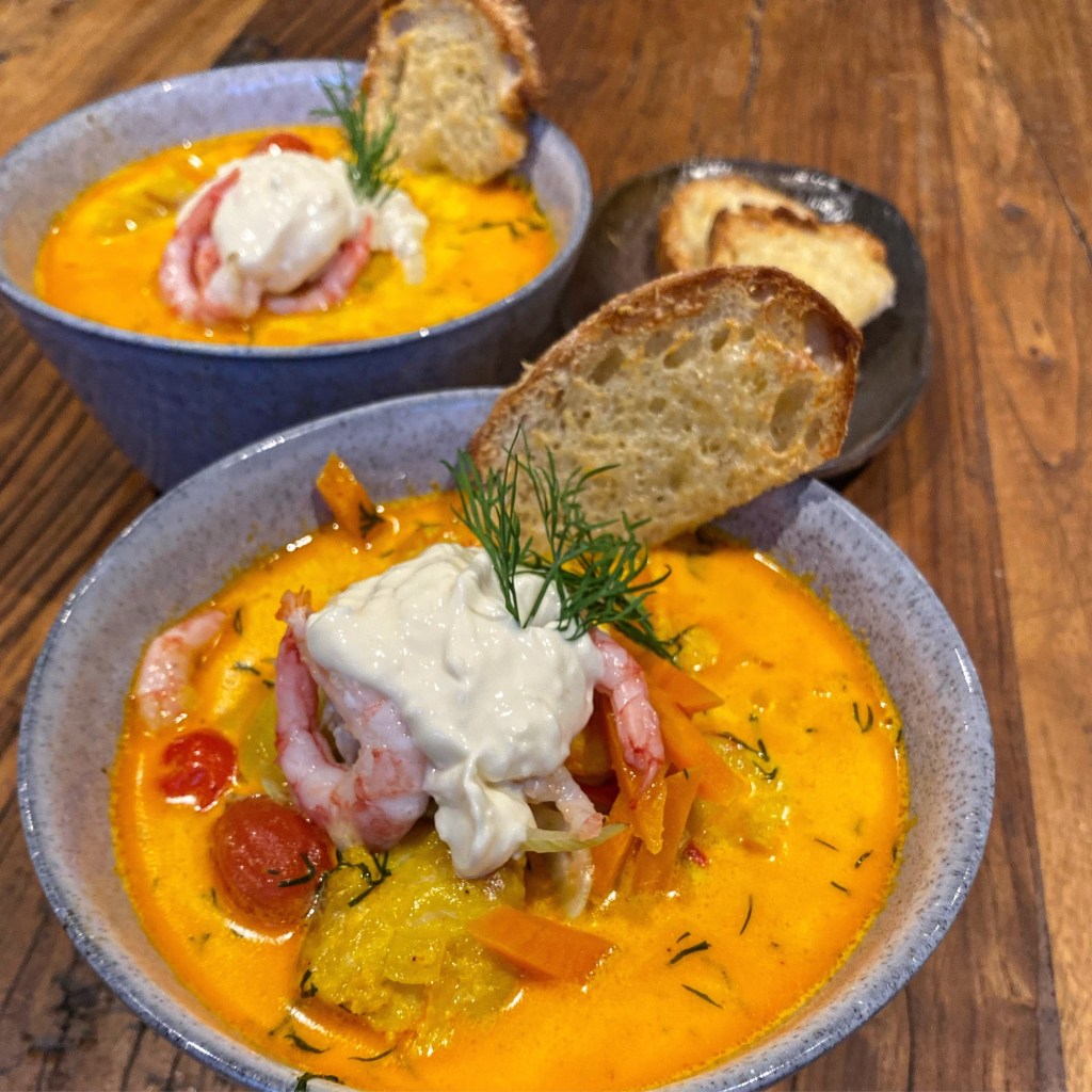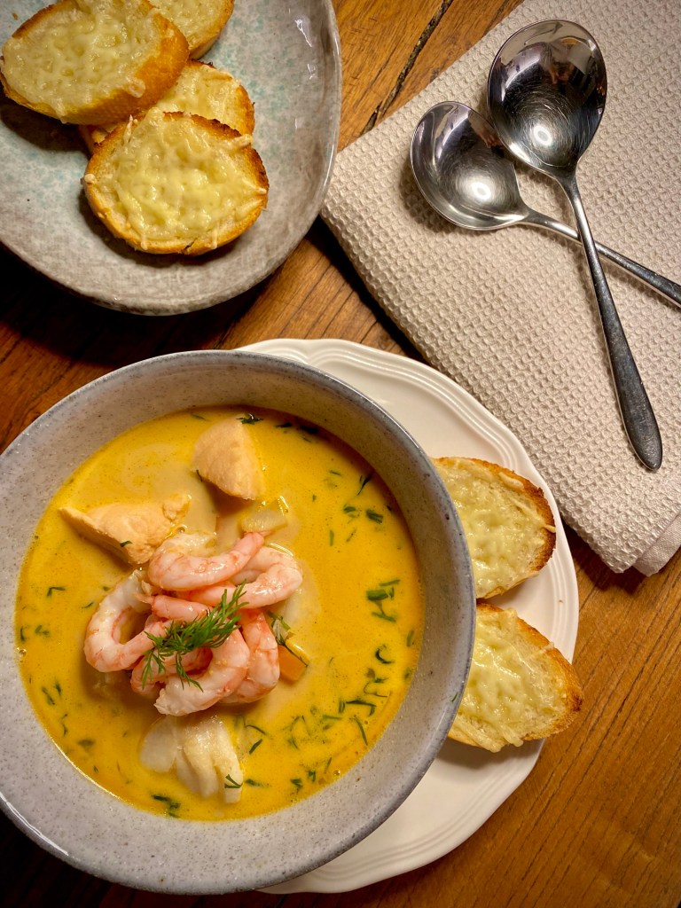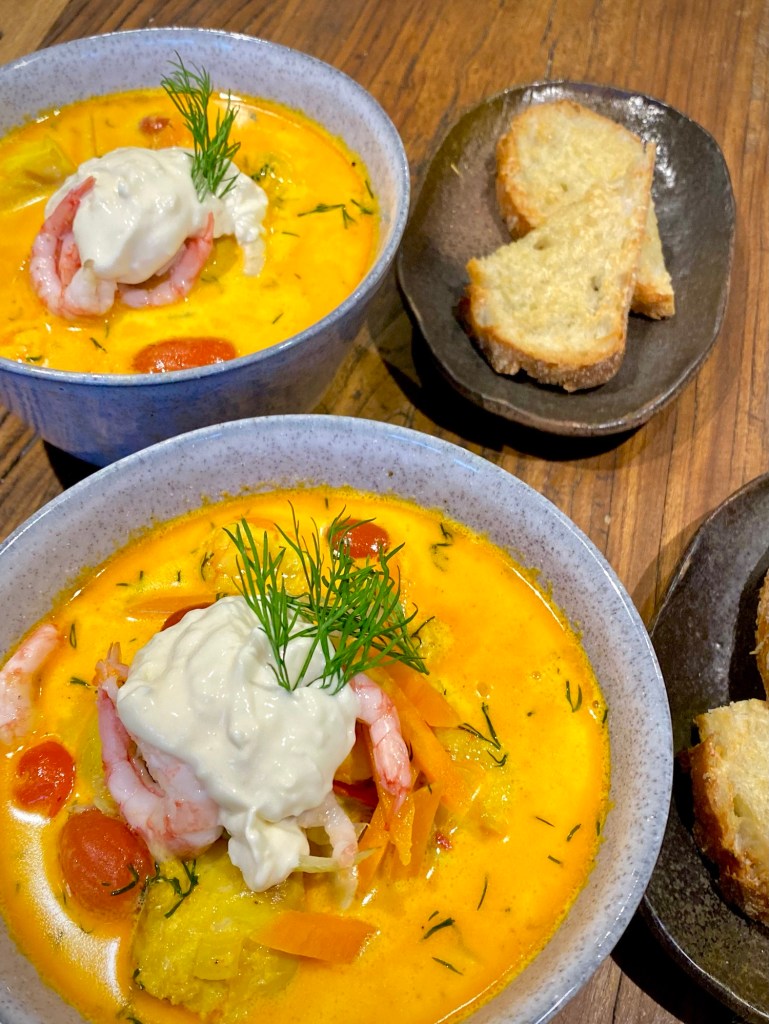 Den här fisksoppan längtar man efter och är en riktig favorit som går snabbt en vardag och är både krämig och mustig. Jag brukar inte ha tomater i, men några små från växthuset fick plats och ger extra smak, väldigt gott.