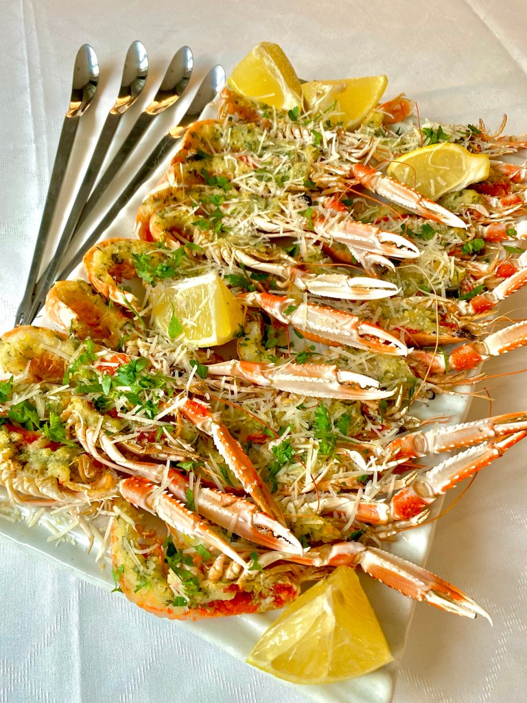 Gratinera kräftorna i övre delen av ugnen på övervärme 250 grader i ca 5 minuter, eller tills de fått fin färg. Toppa med persilja och lite extra parmesan. Servera med citronklyftor.