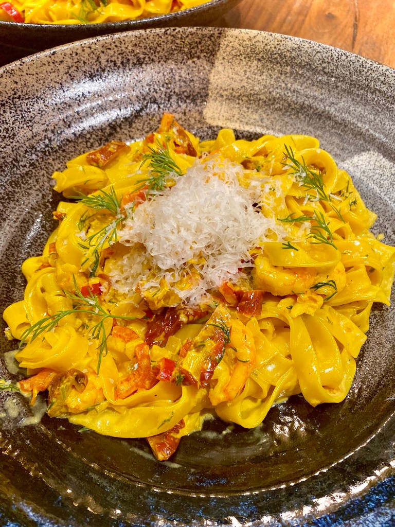 Tagliatelle med räkor i saffranssås
