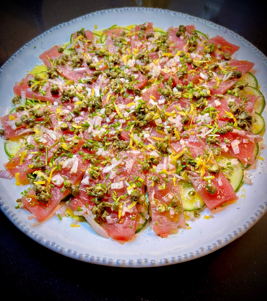Skiva tonfisken fint och ganska tunt och lägg ovanpå. Hacka kapris och lök och lägg i en skål. Tillsätt citronsaft och lite spad från kapris. Fördela jämt över tonfisken med sked. Salta i peppra. Häll över rikligt med god olivolja, citronzest och gräslök. Servera med smörstekt brioche. Skivor som jag delar i tre delar.