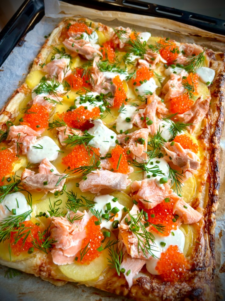 Ta ut flarnet ur ugnen och låt det svalna något. Toppa sedan med varmrökt lax, citronkräm, rom, dill och ärtskott eller andra örter.