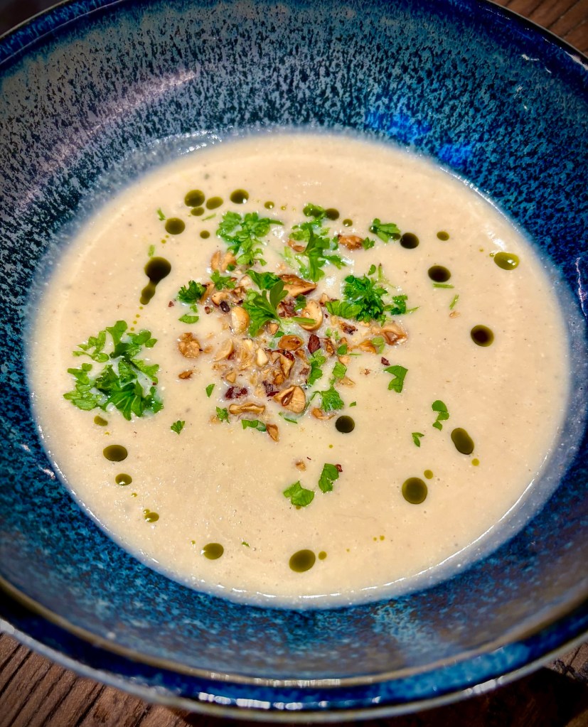 Värmande god soppa på ugnsrostad blomkål serverat med lite hasselnötter, persilja och dillolja.