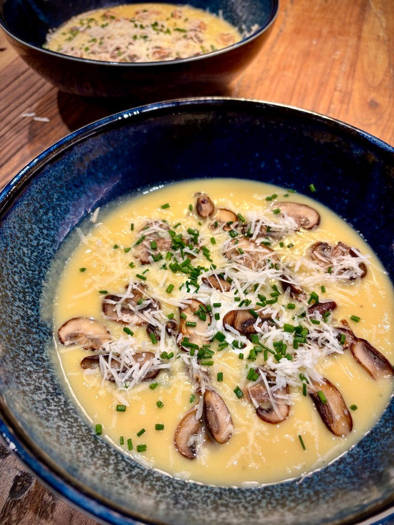 En helt vegetarisk soppa, lagad på rotselleri, jordärtskocka och morot. Lägger på stekt svamp, gräslök och crème fraiche på toppen. Extra gott blir det med lite riven parmesan.