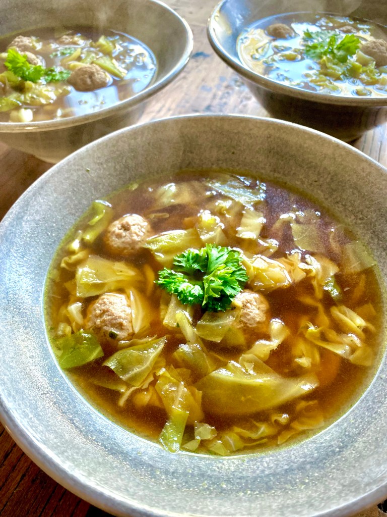 Är det dags för lite nyttig och mager mat? Vi passade på att göra lite kålsoppa med frikadeller. Det finns ju bara fördelar med denna soppa , både nyttigt, magert, enkelt, gott och billigt. Eller hur? Den här är så härlig, och nu när det finns gott om färsk vitkål känns det lite extra lyxigt och gott.