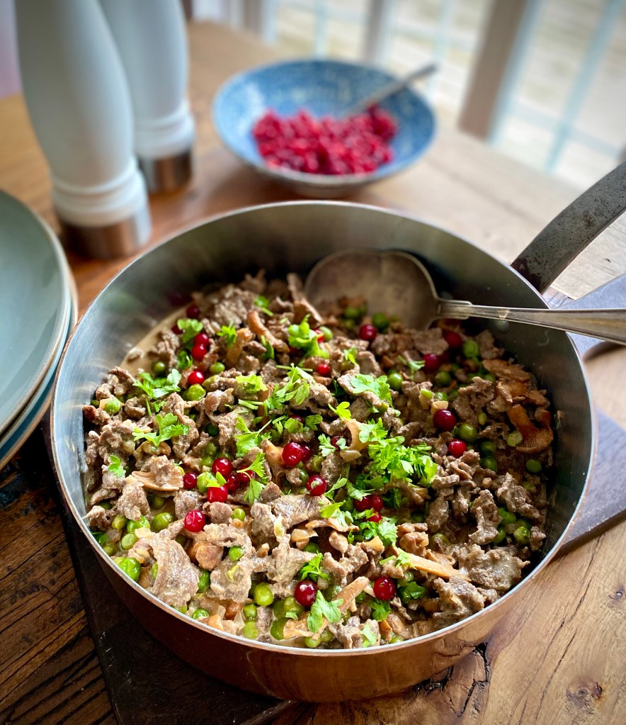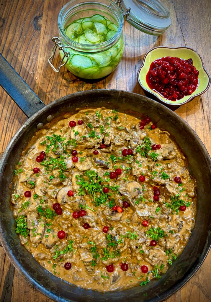 Värmande renskavsgryta med svamp, lök och lingon. Så gott i höst- och vintermörkret. Givetvis med en rejäl klick potatismos. Det är gott, men den godaste renskav jag ätit någonsin var i Rovaniemi, mitt ute i skogen en lördagskväll i januari för 25 år sedan. Vi var med Finnair på rally och skulle heja på den store Kecke Rosberg som körde i ett rally den kvällen. Vi var ett helt gäng som värmde upp med renskav som lagades över öppen eld, och drack vargtass där ute i den mörka skogen i bitande januarikyla, Måste säkert varit minst minus 20 grader, men det var helt fantastiskt och roligt. Och herr Rosberg fick vi skymta när han rusade förbi i 2 snabba sekunder, men minnet är för evigt